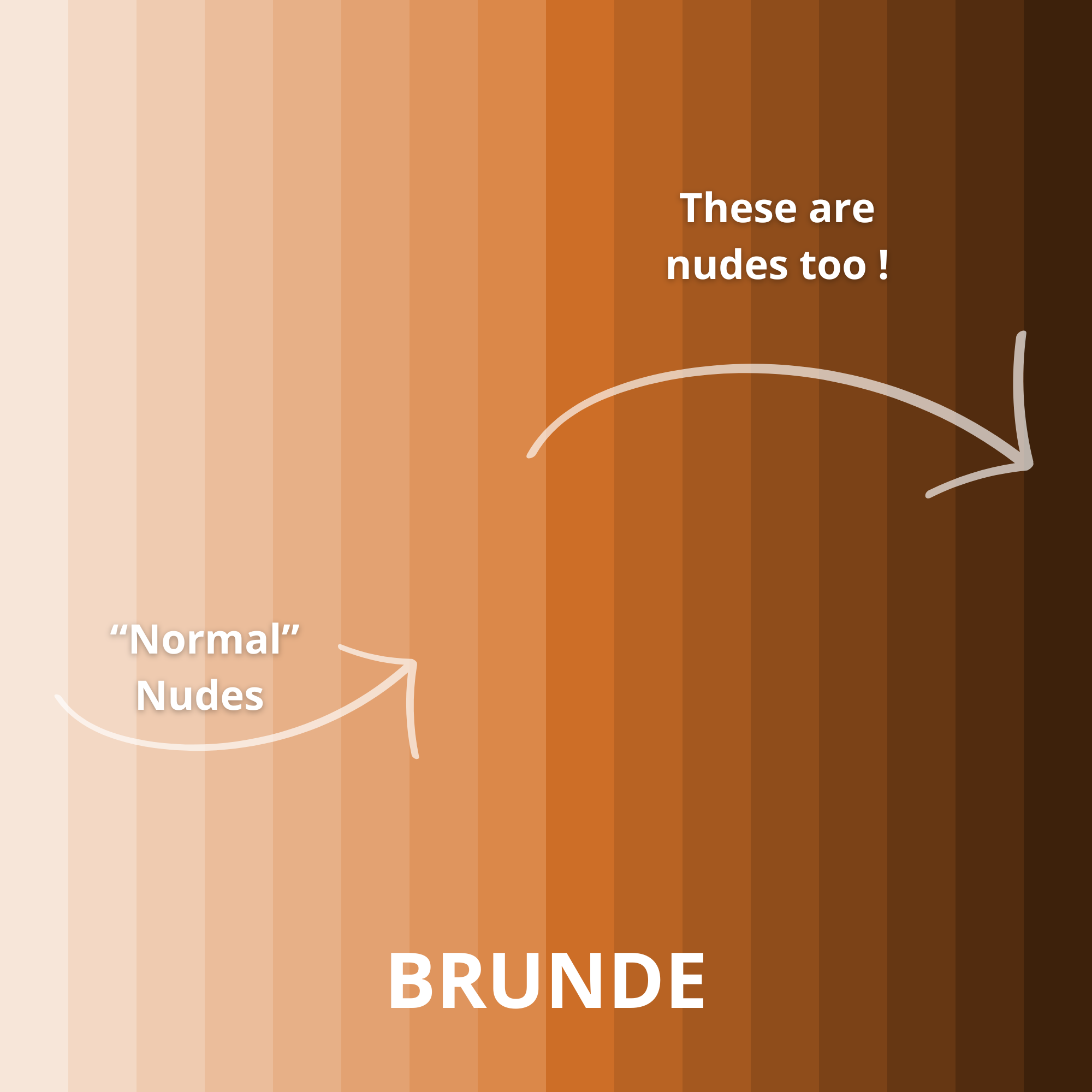Brunde is the combination of the words brun (French for brown) and nude. Our goal? To redefine the norm, because nude colors should be more than just shades of pink and light beige.