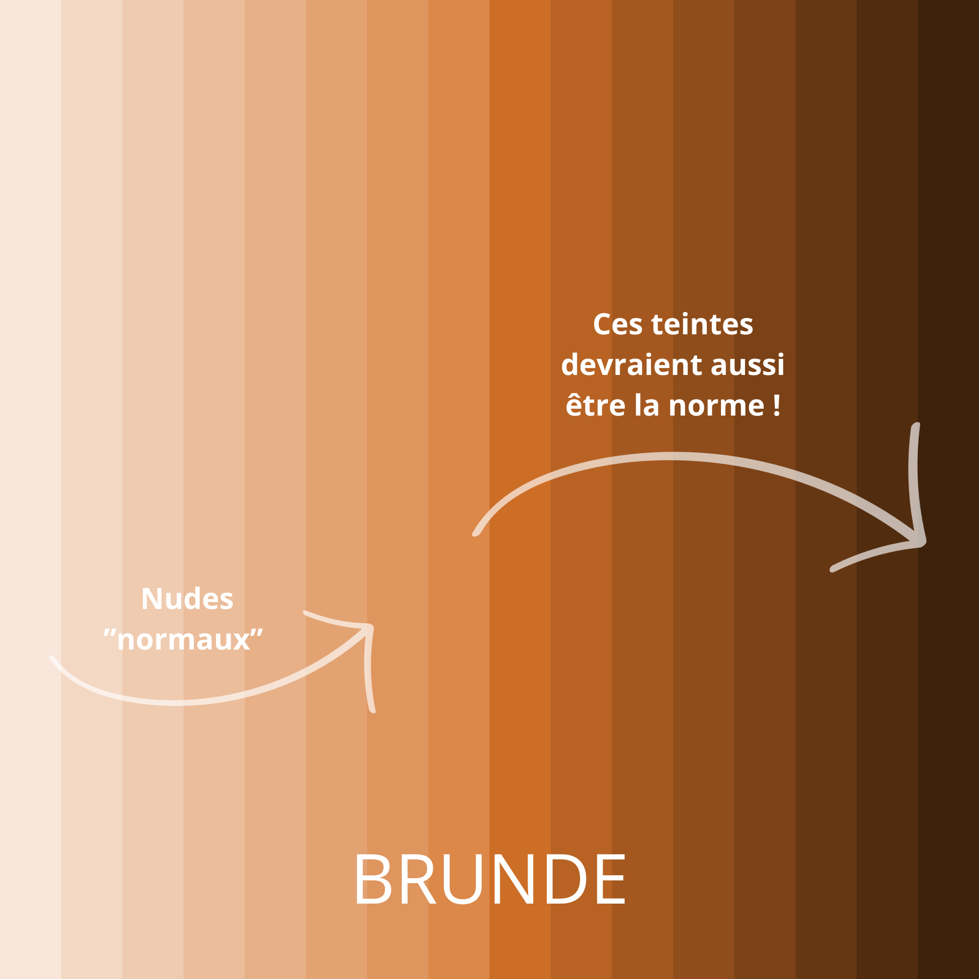 Brunde est la combinaison des mots brun et nude. Notre objectif ? Redéfinir la norme, car les couleurs nudes devraient proposer plus que des nuances de rose et beige clair.